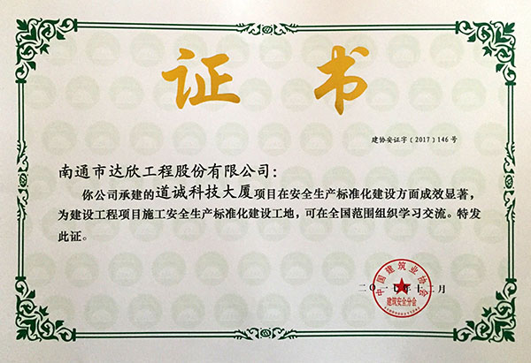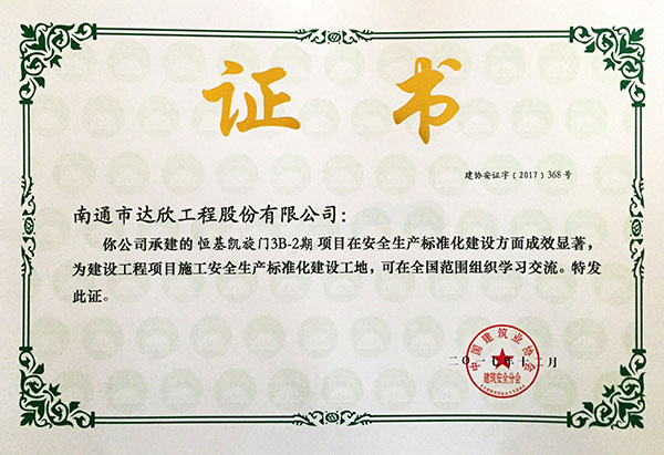 近幾年,我公司獲得全國AAA級安全文明標(biāo)準(zhǔn)化工地25項,創(chuàng)建面涉及上海、江蘇、河北、黑龍江、湖南、新疆等市場,榮譽的取得為進(jìn)一步提升“達(dá)欣”在全國各個市場的影響力,促進(jìn)企業(yè)健康發(fā)展奠定堅實的品牌基礎(chǔ)。