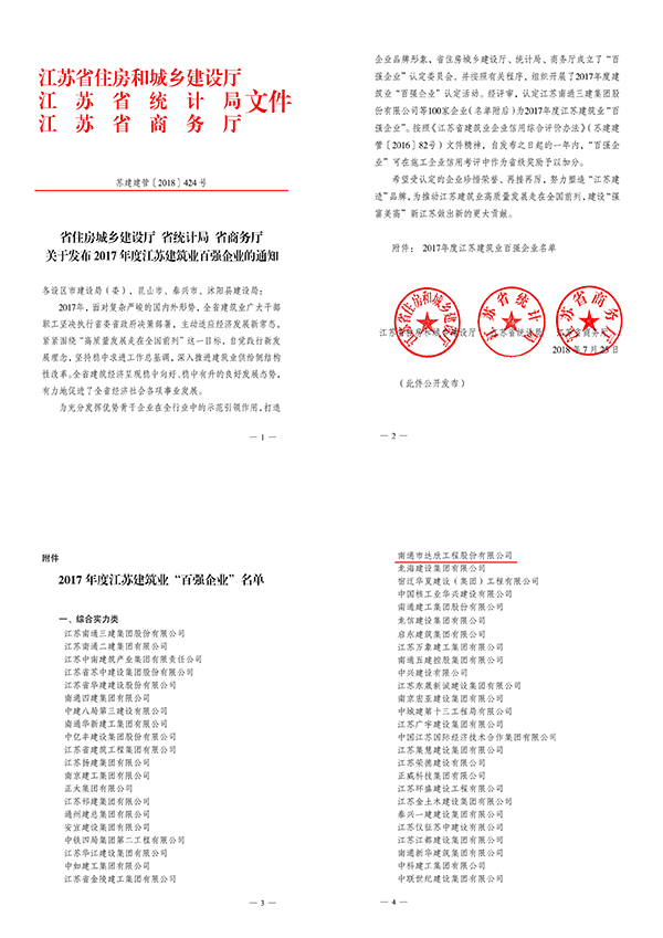 江蘇建筑業(yè)“百?gòu)?qiáng)企業(yè)”是由省建設(shè)廳、省統(tǒng)計(jì)局、省商務(wù)廳成立的“百?gòu)?qiáng)企業(yè)”認(rèn)定委員會(huì)評(píng)議認(rèn)定,從企業(yè)營(yíng)業(yè)額等經(jīng)濟(jì)類(lèi)指標(biāo)、質(zhì)量安全、技術(shù)創(chuàng)新指標(biāo)等方面進(jìn)行綜合評(píng)定,旨在充分發(fā)揮優(yōu)勢(shì)企業(yè)在全行業(yè)中的引領(lǐng)和示范作用,打造建筑企業(yè)品牌,提升核心競(jìng)爭(zhēng)力,是權(quán)威性的政府評(píng)選。同時(shí)按照《江蘇省建筑業(yè)企業(yè)信用綜合評(píng)價(jià)辦法》(蘇建建管〔2016〕82號(hào))文件精神,自發(fā)布之日起的一年內(nèi),“百?gòu)?qiáng)企業(yè)”可在施工企業(yè)信用考評(píng)中作為省級(jí)獎(jiǎng)勵(lì)予以加分。