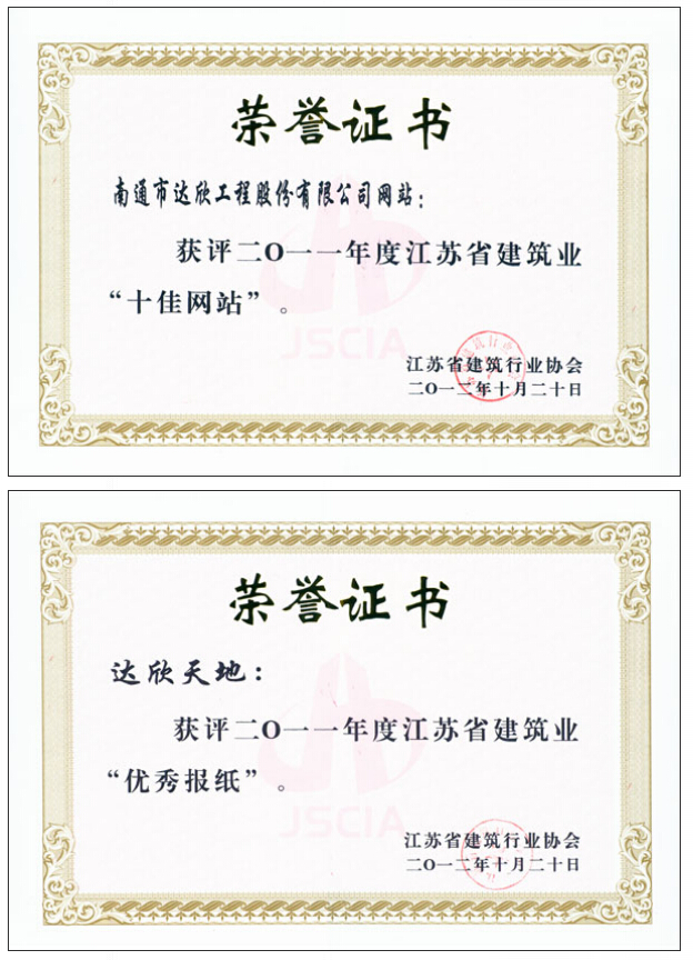 會議同時(shí)對2011年度江蘇省建筑業(yè)優(yōu)秀報(bào)、刊、網(wǎng)和優(yōu)秀通訊員進(jìn)行了表彰,南通市達(dá)欣工程股份有限公司網(wǎng)站榮獲江蘇省建筑業(yè)“十佳網(wǎng)站”、“達(dá)欣天地”報(bào)榮獲江蘇省建筑業(yè)“優(yōu)秀報(bào)紙”。