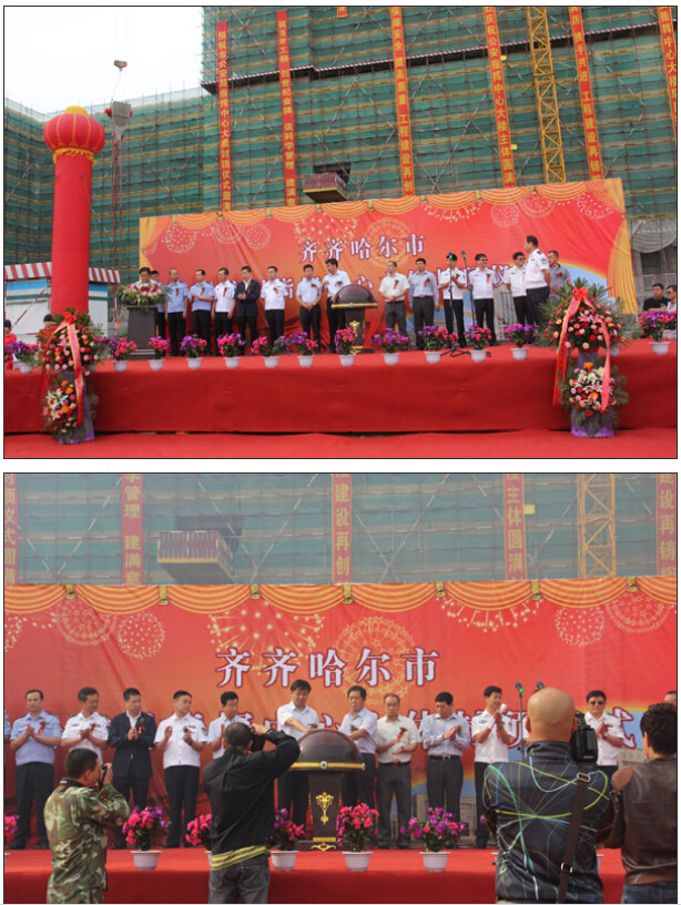 7時(shí)58分儀式正式開始。首先由第七工程公司經(jīng)理王建國同志代表公司董事長馬和軍同志作了熱情洋溢的致辭,齊齊哈爾市副市長、市公安局長吳剛宣布封頂儀式正式開始,并和王建國同志共同啟動(dòng)慶典水晶球,項(xiàng)目建設(shè)各方共同慶賀這一激動(dòng)的人心時(shí)刻。