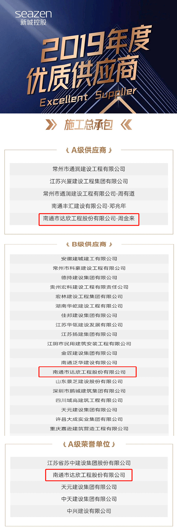 2017年,達(dá)欣集團(tuán)與新城控股攜手以來,先后連續(xù)承建了常熟紫云名邸、新城國(guó)際花都、泰興新城樾府、張家港十里錦繡、蘇州南麻鄰水灣等項(xiàng)目,累計(jì)100多萬平方米。合作的過程中,達(dá)欣集團(tuán)以實(shí)施一流管理、建設(shè)一流工程、創(chuàng)造一流業(yè)績(jī),回報(bào)新城控股的信任和支持,努力將彼此的信任提高到一個(gè)新的高度。2019年,雙方形成“總對(duì)總”對(duì)接模式,為彼此戰(zhàn)略合作的縱深發(fā)展打開新局面。