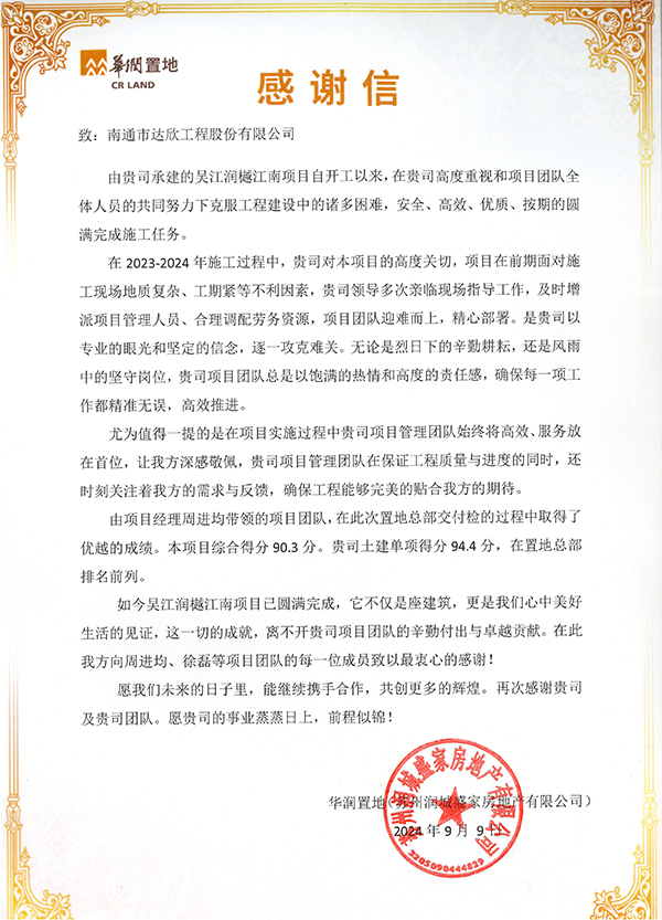 近日,公司收到華潤置地發(fā)來的感謝信,信中對集團第一工程公司承建的吳江潤樾江南項目在施工過程中攻堅克難,嚴把安全生產(chǎn)關,促進項目履約,為華潤置地高質量發(fā)展作出的貢獻表示感謝。