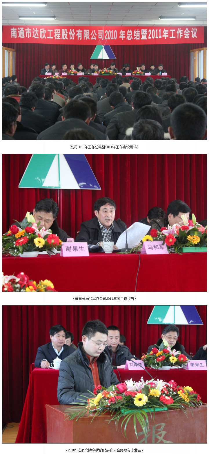 會(huì)議首先由公司董事長馬和軍同志作了題為“砥礪奮進(jìn),繼往開來,二次創(chuàng)業(yè),為實(shí)現(xiàn)達(dá)欣又好又快地發(fā)展而努力奮斗”的 2010年總結(jié)暨2011年工作動(dòng)員報(bào)告。報(bào)告中肯定了過去的一年是達(dá)欣穩(wěn)步發(fā)展的一年,也是達(dá)欣人奮發(fā)有為、積極向上的一年,這一年企業(yè)的美譽(yù)度有了新的提升,企業(yè)的創(chuàng)優(yōu)創(chuàng)新再結(jié)新碩果,企業(yè)的內(nèi)控管理建設(shè)再有新突破;同時(shí)報(bào)告中也著重指出影響企業(yè)持續(xù)健康發(fā)展的一些突出矛盾和問題,報(bào)告最后明確了2011年公司的奮斗目標(biāo)與方向,號召全體達(dá)欣人,要以更加務(wù)實(shí)的精神,更加豪邁的熱情,團(tuán)結(jié)一心,抓住機(jī)遇搶主動(dòng),用好機(jī)遇贏未來,力爭新的一年再有新飛躍,以優(yōu)異的成績向黨的九十周年獻(xiàn)禮!