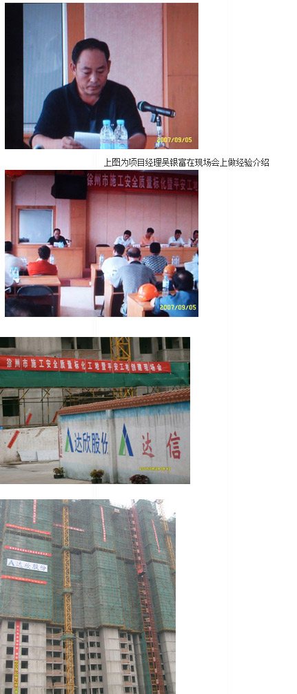 二〇〇七年八月二十日上午,徐州分公司穎都花園2#樓工地彩旗招展,人聲鼎沸。徐州建設(shè)局組織的全市各大施工、監(jiān)理企業(yè)和市安全監(jiān)督處領(lǐng)導(dǎo)在此召開“安全質(zhì)量標(biāo)準(zhǔn)化工地、平安工地現(xiàn)場(chǎng)會(huì)”。與會(huì)人員對(duì)現(xiàn)場(chǎng)的安全防護(hù)、“三寶”、“四口”、“五臨邊”的防護(hù)、安全用電、起重機(jī)械設(shè)備的防護(hù)、安全通道、腳手架圍護(hù)以及現(xiàn)場(chǎng)的亮化美化給予了很高的評(píng)價(jià)。項(xiàng)目經(jīng)理吳銀富在隨后召開的經(jīng)驗(yàn)交流會(huì)上作了“以人為本創(chuàng)平安規(guī)范管理建標(biāo)化”的發(fā)言,作了以下幾方面的經(jīng)驗(yàn)介紹:
