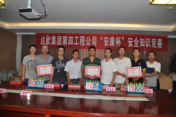 各項目部在建筑物上懸掛安全生產宣傳標語24條幅;組織廣大職工觀看建筑施工中的事故案例,結合施工過程中的實際情況進行分析點評;對全體職工進行了血壓檢測;舉行了“安全生產月”主題簽名活動。工程公司于6月8、9日在留村項目部組織所有在崗管理人員進行了安全知識培訓。6月22日工程公司舉行了“安康杯”安全知識競賽,24名選手分8組參賽。經(jīng)過必答題、搶答題、附加題3個環(huán)節(jié)的比拼,最終眾美綠都項目部以領先笫二名25分的優(yōu)勢獲得冠軍,拉斐小鎮(zhèn)、留村莊園A區(qū)分獲二、三名。通過以上活動的開展,進一步提高了廣大職工的安全生產知識和安全意識,確保安全生產。