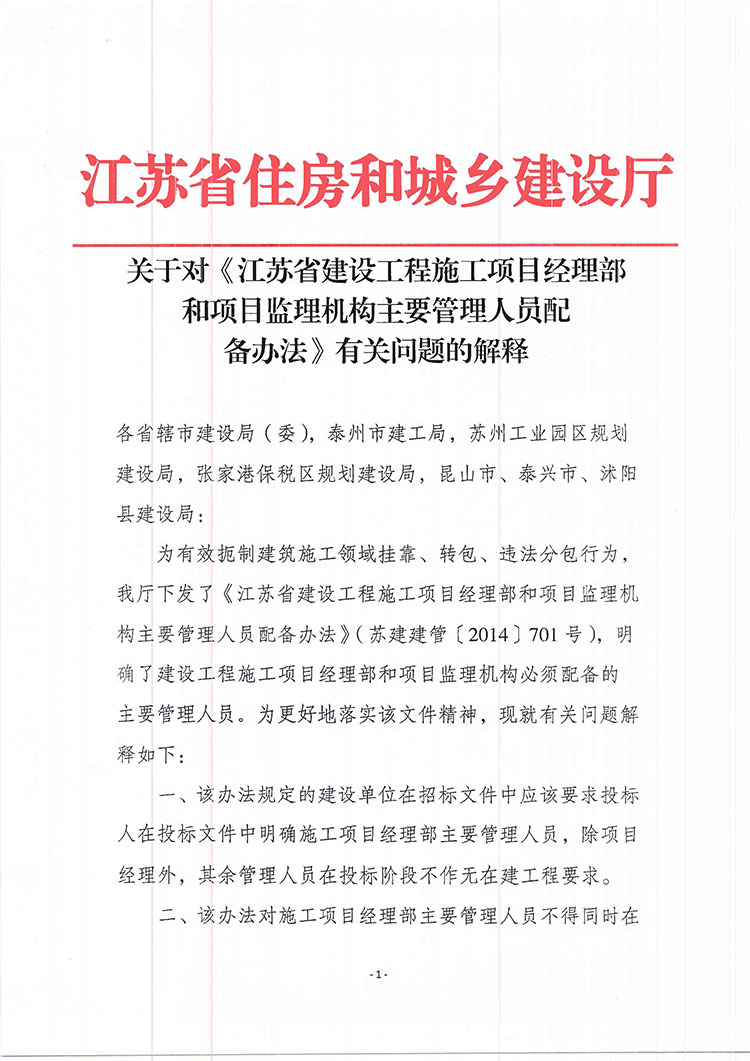 附件:關于對《江蘇省建設工程施工項目經理部和項目監(jiān)理機構主要管理人員配備辦法》有關問題的解釋